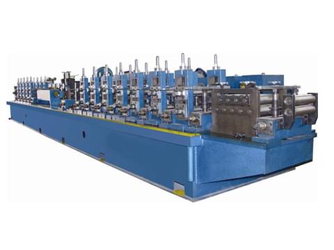 高頻焊管機(jī)是以帶鋼為原料,經(jīng)開卷、成型、高頻焊接、解決焊瘤、定徑、校直、切斷等一系列制管工序制造出圓鋼管或各樣式一行鋼管的成套設(shè)備。采用輥式成型將帶鋼冷彎加工成圓坯,通過高頻感應(yīng)加熱將焊縫擠壓形成圓管,在經(jīng)過定徑加工生產(chǎn)出各樣式標(biāo)準(zhǔn)規(guī)格的圓管、方矩形管。
